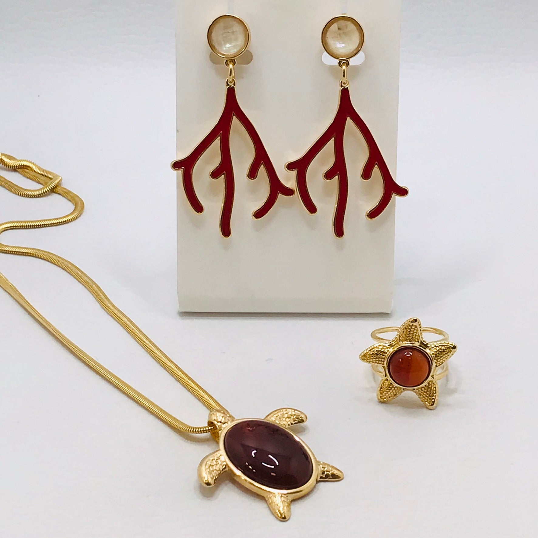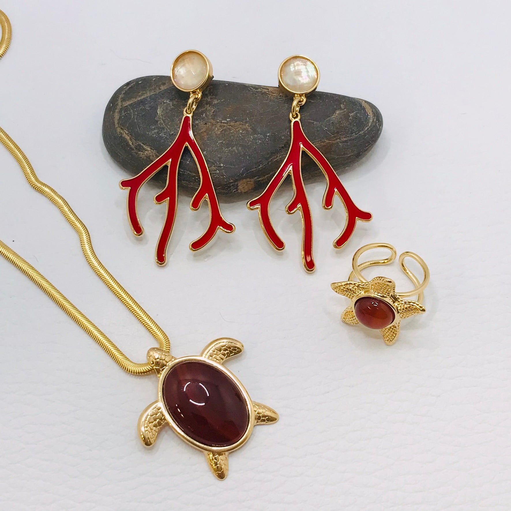 Sea Stars are the always present coral inhabitants. They fascinate us buy their mobility, shape and texture. This ring reproduces it on an 18K gold plated piece with a central red agata that remits to the corals color!